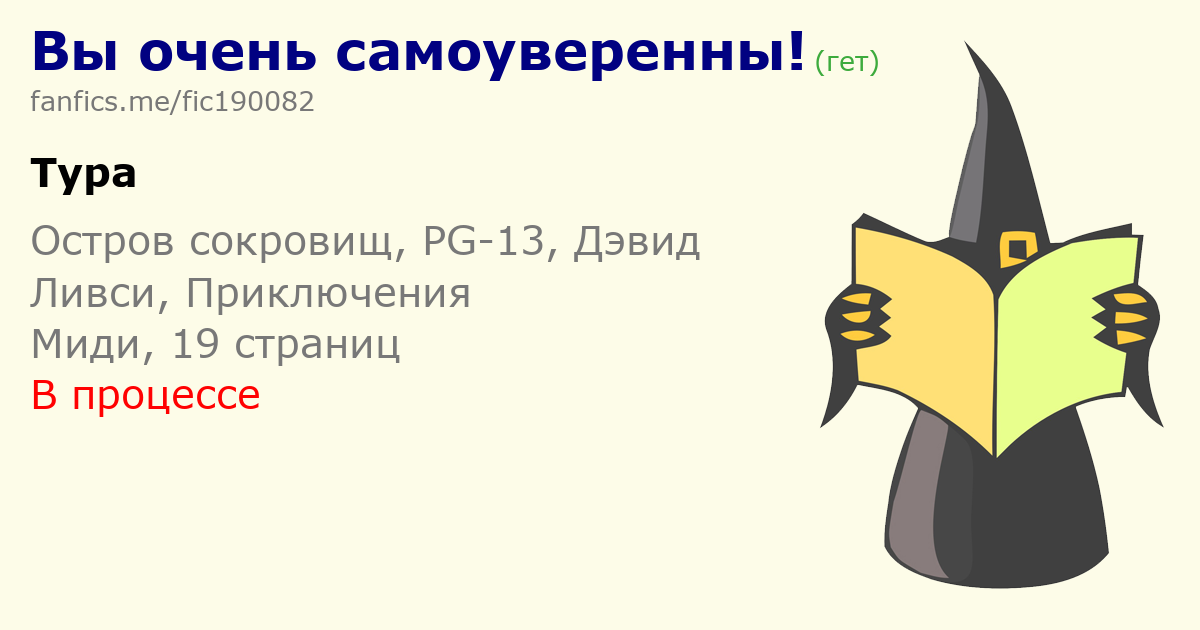 <a href="https://fanficscb.ru/fic190082"><b>Вы очень самоуверенны!</b></a> (гет)<br>Автор: <a href="https://fanficscb.ru/user826404">Тура</a><br>Фандом: <a href="https://fanficscb.ru/fandom676">Остров сокровищ</a><br>Персонажи: <a href="https://fanficscb.ru/character37060">Дэвид Ливси</a>, <a href="https://fanficscb.ru/character39">Новый Женский Персонаж</a><br>Рейтинг: PG-13<br>Жанр: Приключения<br>Размер: Миди | 46 701 знак<br>Статус: В процессе<br>События: Постканон<br>Саммари:<br>Силуэт захлопнул книгу и положил на стол, спрыгнул с сундука, медленно с достоинством подошёл к Ливси...